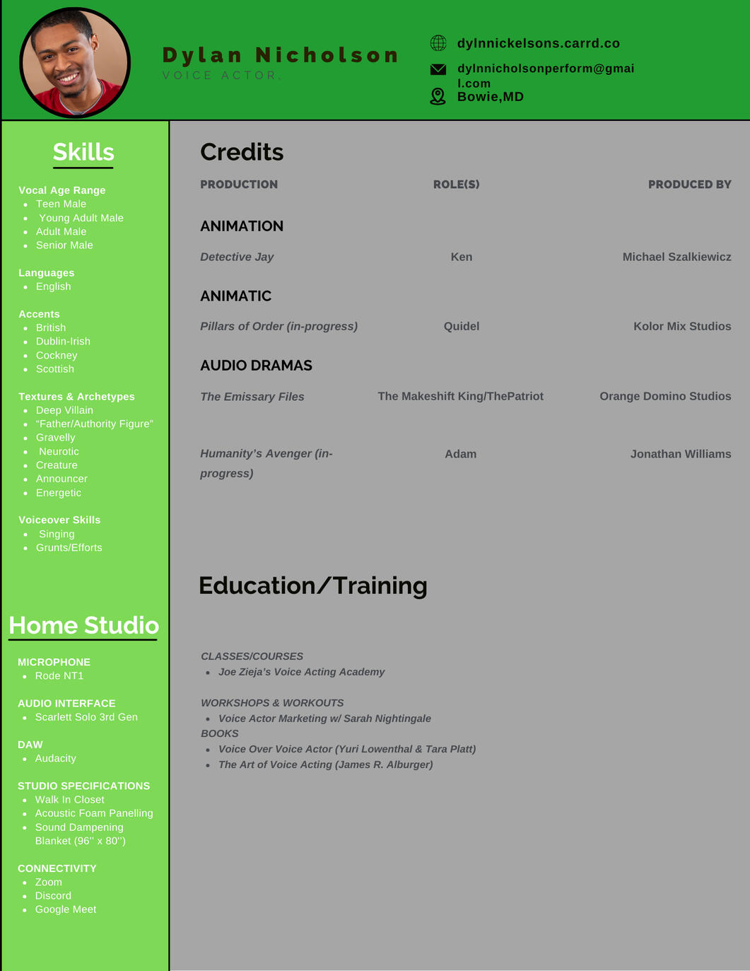 After over ten years of ongoing work in stage, screen, and voice, I'm working to constantly challenge myself as an actor, learn whatever I need to better cooperate with others and create something truly special in people's projects. It'll be a pleasure to work with you!